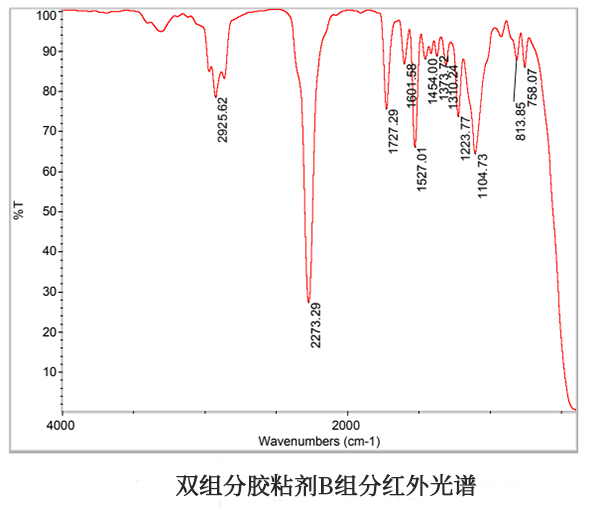 圖2-2為聚氨酯膠粘劑B組分的紅外光譜。能夠得知3373.3cm-1周邊為異氰酸根特征吸收峰。在其中1727.3cm-1附近為酯基吸收峰,2925.6cm-1附近為甲基、亞甲基的伸縮振動峰,1601cm1,1527cm-1,1454cm-1,1373cm-1為苯環(huán)C=C伸縮振動峰。從而我們能推論這種情況分為芳香族異氰酸根組分,其結(jié)構(gòu)中含有較多的烷基。