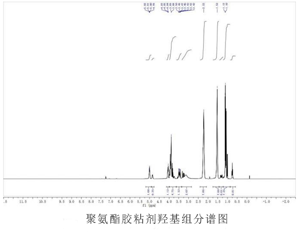 我們還可以用HNMR對聚氨酯的結(jié)構(gòu)進(jìn)行定性、定量的解析。以聚氨酯的羥基組分為例(下圖所示):從1HNMR 可知,0.75ppm處為三羥甲基丙烷(TMP)的-CH3,1.12 ppm處為2-甲基丙二醇中-CH3化學(xué)位移,1.52 ppm、2.22 ppm處兩組峰分別為己二酸上兩類-CH2-,5.02-4.99 ppm處兩組峰為2-甲基丙二醇與-OH相連的CH2、CH的化學(xué)位移, 4.07-3.42 ppm處為與酯基-COO-相連的-CH2。根據(jù)各特征峰的積分面積,還可以推導(dǎo)出各組分含量。己二酸為56.8%,2-甲基丙二醇為35.5%。三羥甲基丙烷為7.2%。
