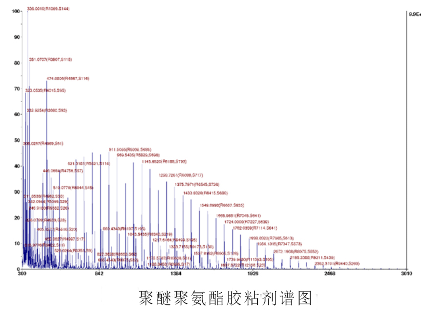 基質(zhì)輔助激光解析電離飛行時間質(zhì)譜是近年來發(fā)展起來的一種軟電離新型有機(jī)質(zhì)譜。其中心技術(shù)就是依據(jù)樣品的質(zhì)荷比(m/z)的不同來進(jìn)行檢測,并測得樣品分子的分子量。聚氨酯膠粘劑中的聚醚結(jié)構(gòu),就可以通過MALDITOF譜圖確認(rèn)聚醚結(jié)構(gòu)的分子量、EO/PO比例、嵌段共聚或無規(guī)共聚等。如圖4所示,圖中相隔58的峰為聚醚多元醇的特征峰,進(jìn)一步解析可知該聚醚結(jié)構(gòu)分子量為1000,合成單體為環(huán)氧聚丙烷。