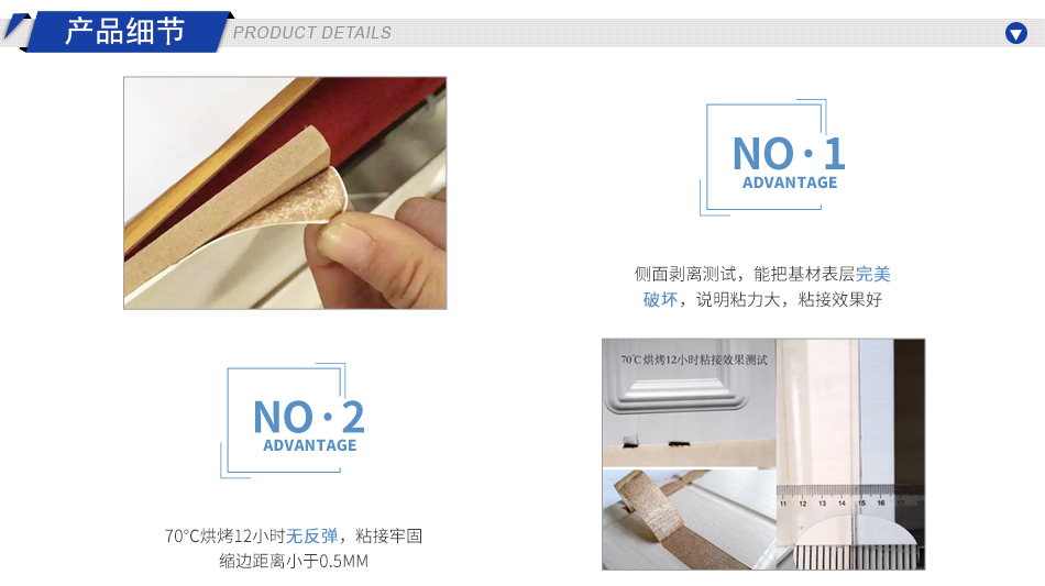 2.粘接效果好,表面平整,側(cè)邊牢固,側(cè)面剝離測試,能把基材表層完美破壞。